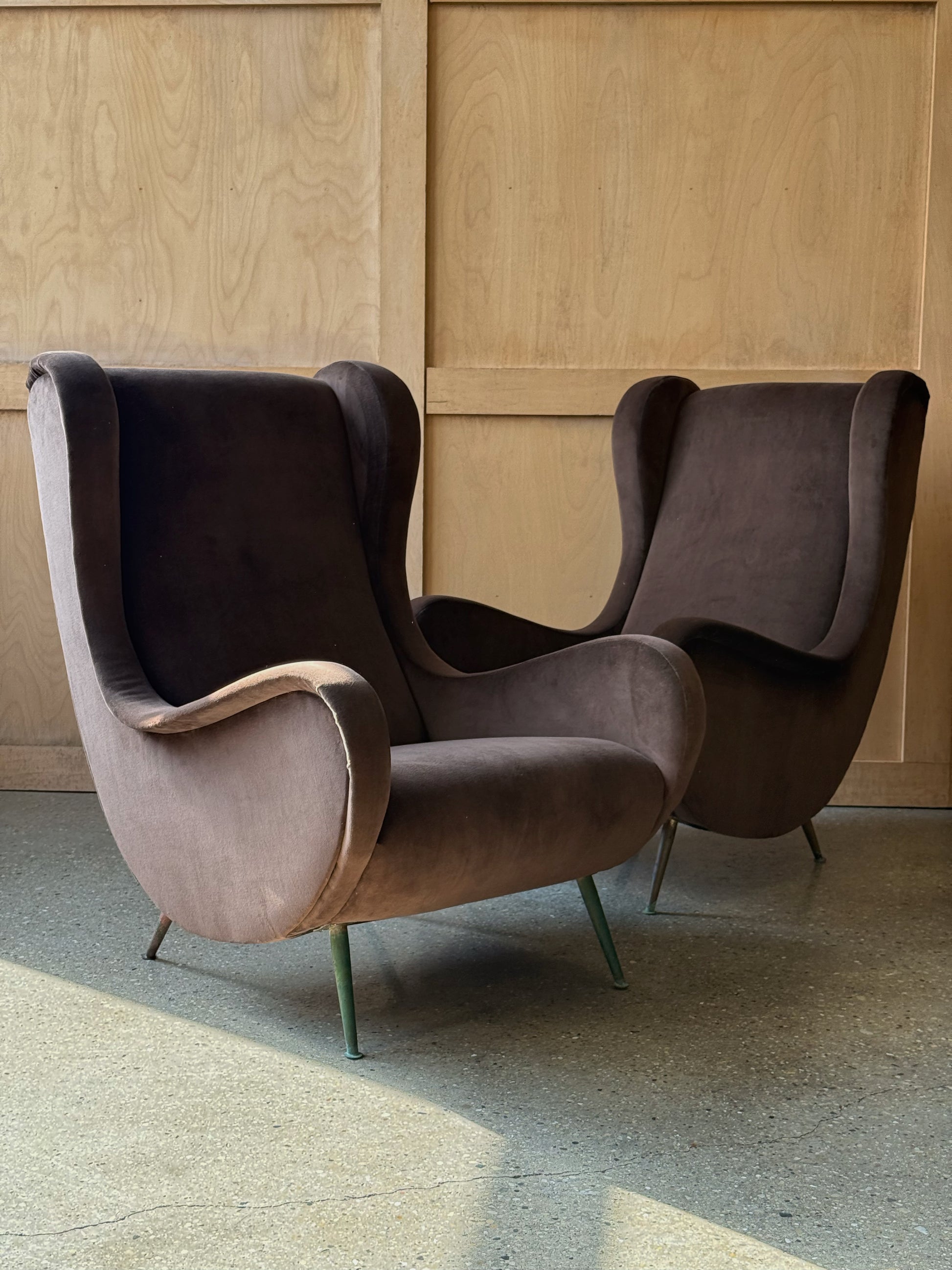 A pair of newly upholstered “Senior Chairs” attributed to Marco Zanuso. Made in Italy, c. 1950’s. These beautiful wing backed lounge chairs have elegant curves and a unique patina on their legs. They could work in a variety of interiors and would really elevate the room. Newly upholstered in brown/chocolate velvet.